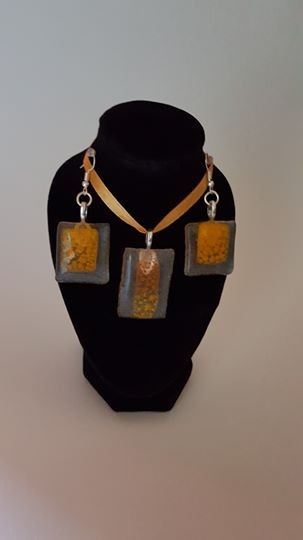 Ensemble de bijoux (collier et boucles d'oreilles) en fusing de couleur orange avec un effet artifice en décoration.