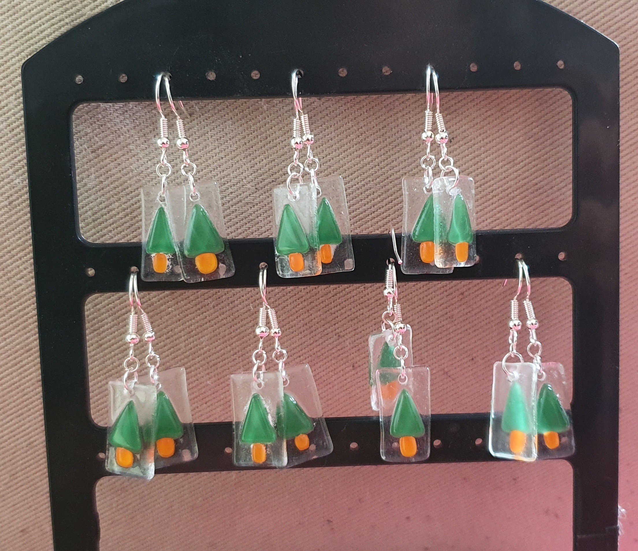 Je vous présente plusieurs boucles d'oreilles puces rectangle  avec en décor des sapins.