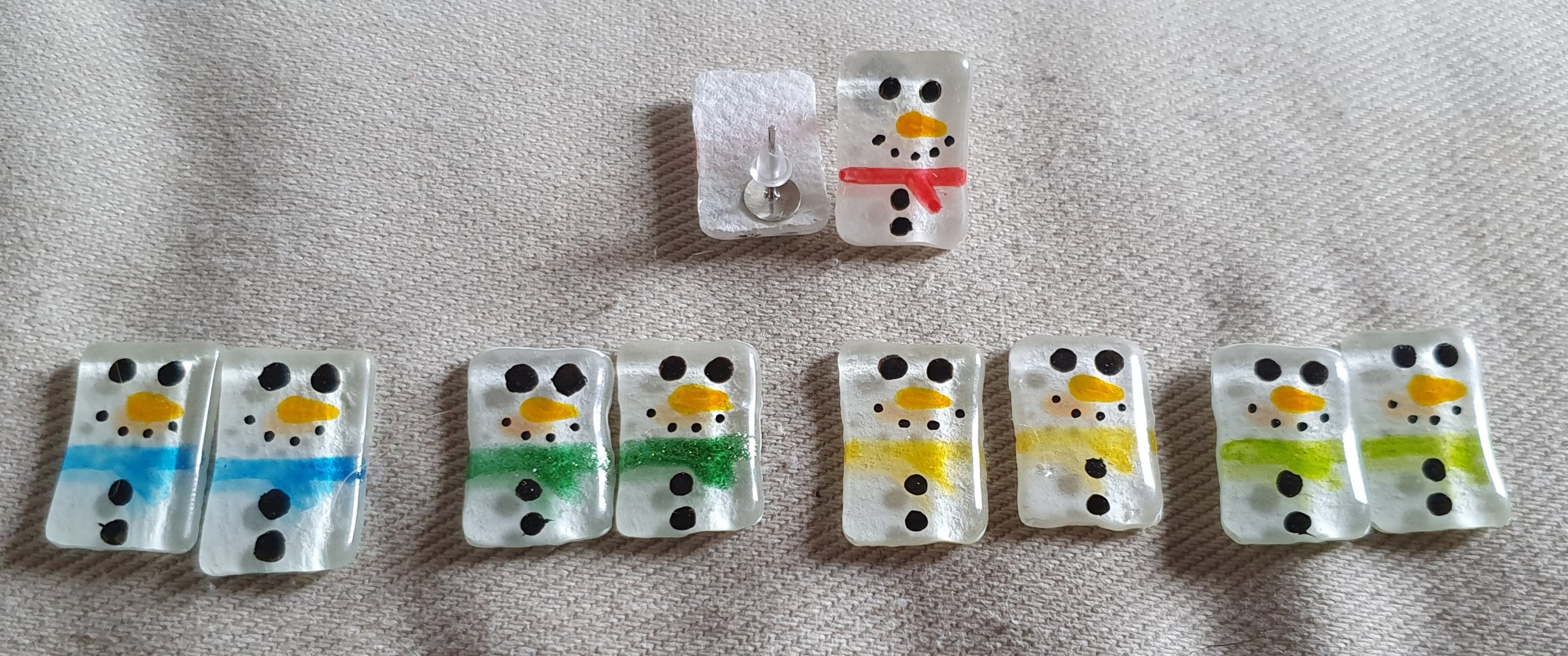 Je vous présente plusieurs boucles d'oreilles puces décorées en bonhomme de neige de différentent couleurs (rouge, bleu  vert brillant, vert clair, jaune...).
