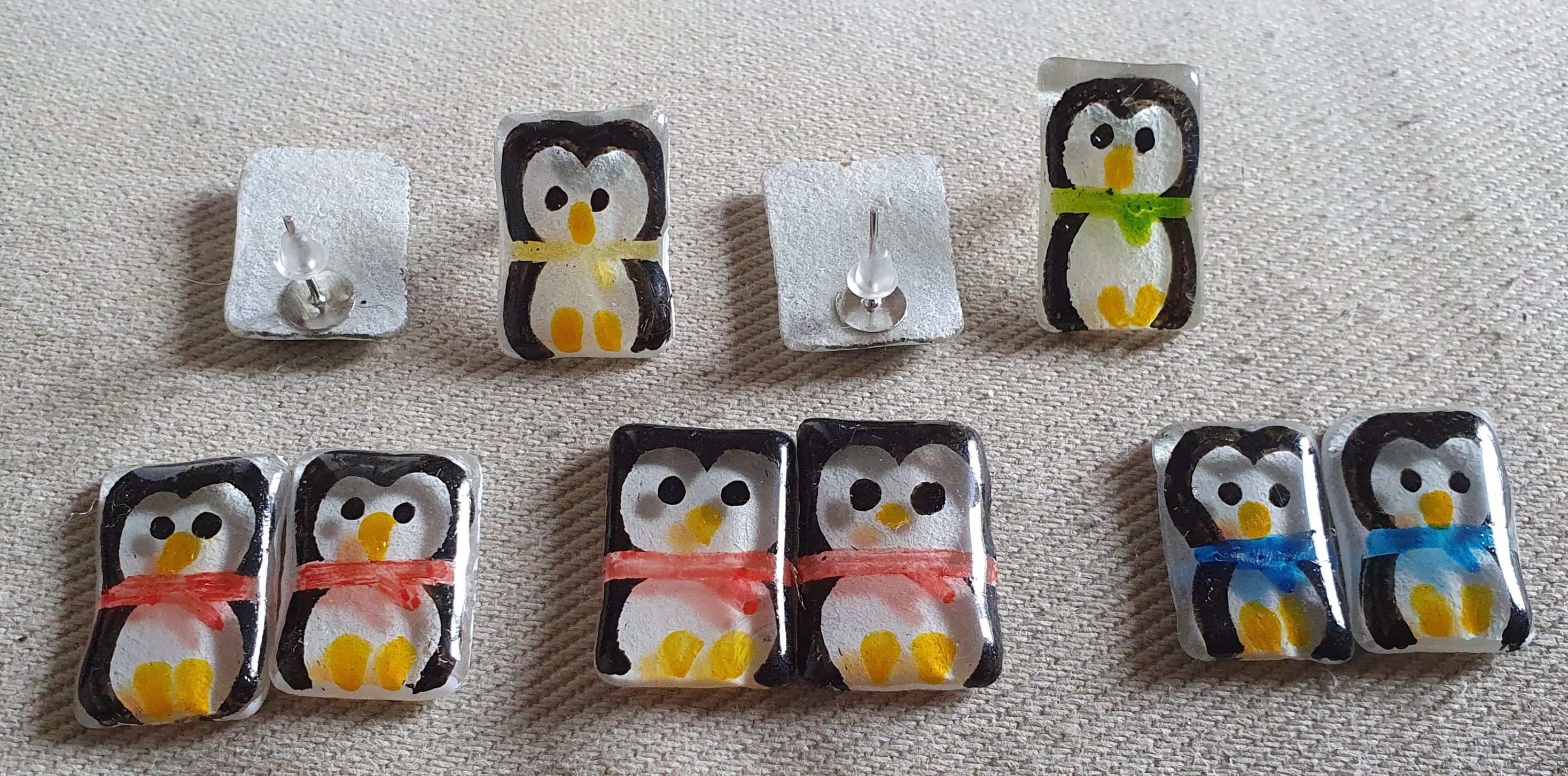 Je vous présente plusieurs boucles d'oreilles puces pingouin de différentent couleurs (rouge, bleu, vert brillant, vert clair, jaune...).